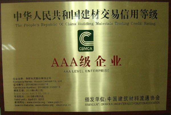 近日,由公司營銷管理中心申報,經中國建筑材料流通協會評定、審核,華新水泥股份有限公司榮獲中華人民共和國建材交易信用等級評價AAA級(頂級)優秀企業稱號。