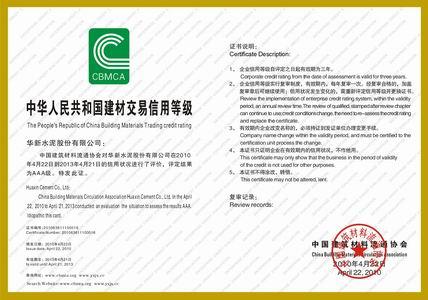 “建材交易信用等級”評定是商務部、國資委授權的中國建筑材料流通協會開展的全國范圍的建材企業信用評價工作,是“全國建材交易信用等級萬家數據庫工程”的重要組成部分。“建材交易信用等級”是我國建材產品流通中最為重要的誠信指標,也是企業在商務交往中最為有用的指標,更將對“建材下鄉”的政策傾斜有重要影響。據悉,華新水泥是湖北省唯一授予企業信用等級AAA級信用企業的建材企業。