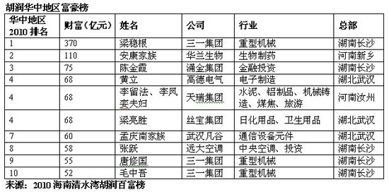 根據《2010胡潤百富榜》,華中地區上榜富豪總財富為2,465億元,總共81人,其平均財富30億元,總榜平均財富39億元。