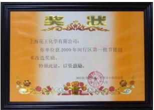 上海花王化學公司自生產開始以來,隨著逐年增長的生產量,能源消耗也隨之增大,因此上海花王公司從2008年開始,全公司一起為節能減排而出謀劃策。在進行了一系列整改措施后,至2009年,公司被上海閔行區經濟情報委員會授予“2009年閔行區節能技術改造獎”獎。2009年9月中國上海閔行區經濟情報化委員會經過政府派遣專家進行數次實地考察核審,最后決定授予上海花王化學有限公司“2009年度閔行區第一節能改造項目獎”。上海花王化學因對硫酸化制品的排熱回收高出原來的5%,并在一年間減少CO2排放量903噸的成果而受賞。2010年7月獲得“上海節能獎”,這個獎項是頒發給二氧化碳減少1300噸以上企業的。