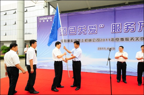 2011年6月20日上午11點,綿綿細雨為火熱的長沙帶來了絲絲涼意,在中聯重科麓谷工業園前坪,來自營銷、技術、品質、市場各個部門的員工們精神飽滿,熱情高漲,一字排開的售后服務車整裝待發。中聯重科混凝土機械公司主題為“藍色關愛”的服務萬里行活動啟動儀式在這里隆重舉行,這次服務活動將于6月20日至8月20日在全國30個省份集中開展,為期60天。中聯重科高級總裁、混凝土機械公司總經理張建國,副總經理李青林、曾剛,總工程師吳斌興等領導參加了此次啟動儀式。近500名員工集體歡送了服務分隊隊員。
