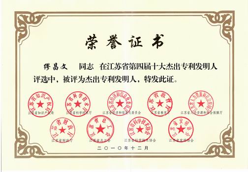 近日,江蘇省知識(shí)產(chǎn)權(quán)局召開全省知識(shí)產(chǎn)權(quán)局局長(zhǎng)會(huì)議。正在北京參加第十一屆全國(guó)人大四次會(huì)議的繆昌文董事長(zhǎng)被授予“江蘇省第四屆十大杰出專利發(fā)明人”榮譽(yù)稱號(hào),并予表彰和獎(jiǎng)勵(lì)。
