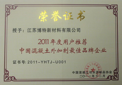近日,中國混凝土與水泥制品協(xié)會(huì)2011年會(huì)在徐州隆重召開。繆昌文董事長、李小華副總經(jīng)理、技術(shù)開發(fā)部劉建忠副主任出席會(huì)議。此次年會(huì)的主題是“優(yōu)化產(chǎn)業(yè)結(jié)構(gòu),借力金融資本,做大做優(yōu)做強(qiáng)”,以促進(jìn)行業(yè)企業(yè)成功轉(zhuǎn)型,并通過轉(zhuǎn)型實(shí)現(xiàn)更好更大的發(fā)展。會(huì)議期間,江蘇博特新材料有限公司被授予了“2011年度用戶推薦中國混凝土外加劑最佳品牌企業(yè)”稱號(hào),李小華副總經(jīng)理代表公司接受獎(jiǎng)牌和證書。