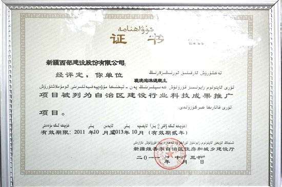 近日,科研檢測(cè)公司研發(fā)的新產(chǎn)品—現(xiàn)澆泡沫混凝土以?xún)?yōu)異的產(chǎn)品性能指標(biāo)和完善的施工工藝順利通過(guò)了由自治區(qū)建設(shè)廳、經(jīng)信委組織的專(zhuān)家鑒定,獲得自治區(qū)建設(shè)廳和經(jīng)信委頒發(fā)的“雙證”—《自治區(qū)新產(chǎn)品鑒定證書(shū)》和《自治區(qū)科技成果推廣證書(shū)》,為公司在新型建筑保溫材料領(lǐng)域成功開(kāi)拓市場(chǎng)邁出了第一步,也是公司取得的第八項(xiàng)自治區(qū)級(jí)新產(chǎn)品成果鑒定。