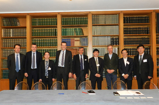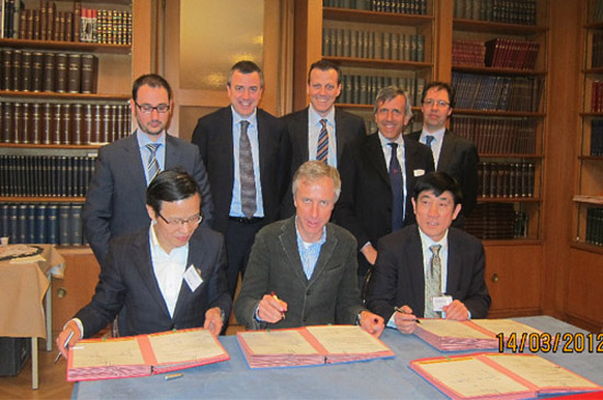 意大利水泥集團(tuán)CEO Pesenti,天津公司董事長(zhǎng)彭建新,中材國(guó)際副總裁童來(lái)茍分別代表三方在合同上簽字。