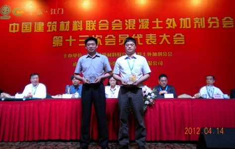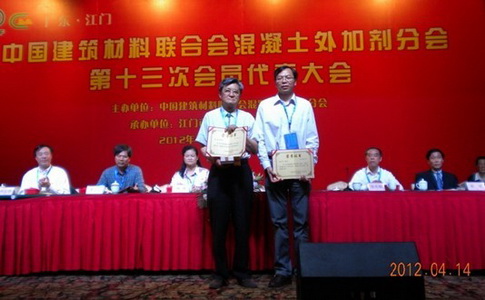 會上,繆昌文董事長和劉加平總經理分別當選為混凝土外加劑分會第七屆理事會分會副理事長和常務理事,冉千平博士當選為華東地區的副秘書長。大會對優秀企業、優秀論文及先進工作者進行了表彰。我公司榮獲“優秀重點聯系企業”、“優秀理事單位”和“全國建材行業靠新出強優秀企業”等稱號,同時還獲得了“2012年科隆杯混凝土外加劑研究與應用新進展”優秀論文二等獎1篇,三等獎1篇,“2008年-2011年《中國混凝土外加劑》優秀論文”2篇;劉加平總經理被授予“2010-2011年度分會先進工作者”榮譽稱號,冉千平博士被授予“優秀組織獎”。