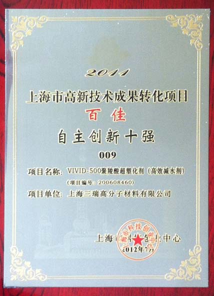 為鼓勵企業創新,促進科技成果加速轉化,上海市科技創業中心組織“2011年度上海市高新技術成果轉化項目百佳及自主創新十強的評選活動”,經篩選評議、專家評審、網上公示,三瑞企業VIVID-500聚羧酸超塑化劑(高效減水劑),項目編號:200608460榮獲“自主創新十強”及“高新技術成果轉化項目百佳”稱號。