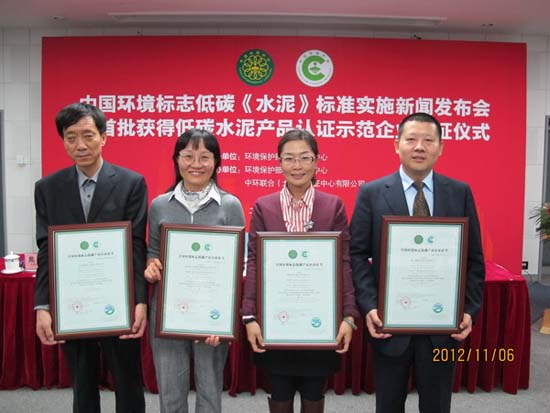 2012年11月6日,中國環(huán)境標(biāo)志低碳水泥標(biāo)準(zhǔn)實(shí)施新聞發(fā)布會(huì)暨首批獲得中國環(huán)境標(biāo)志低碳水泥產(chǎn)品認(rèn)證示范企業(yè)頒證儀式在環(huán)境保護(hù)部環(huán)境發(fā)展中心正式召開。拉法基瑞安旗下四川都江堰廠、重慶南山廠和地維廠、云南富民廠以及其他10家水泥廠在此次發(fā)布會(huì)上獲得中國環(huán)境標(biāo)志低碳水泥產(chǎn)品認(rèn)證示范企業(yè)稱號,成為首批獲此殊榮的企業(yè)。環(huán)保部科技標(biāo)準(zhǔn)司、科學(xué)技術(shù)部社會(huì)發(fā)展司、中國建筑材料科學(xué)研究總院以及水泥協(xié)會(huì)和環(huán)境認(rèn)證中心的領(lǐng)導(dǎo)出席了此次新聞發(fā)布會(huì),并為獲得認(rèn)證示范企業(yè)的單位頒發(fā)了低碳水泥標(biāo)志。