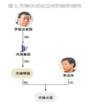 這些承包、收購而來的國有/集體水泥企業,成為了天瑞集團水泥業務最早的家底。2000年9月28日,以這些家底作為基本資產,李留法組建了天瑞集團水泥有限公司。成立伊始,天瑞水泥的注冊資本為500萬元,由天瑞集團全資擁有的天瑞鑄造持股90%,剩余10%由李留法的胞弟李法伸持有(圖1)。