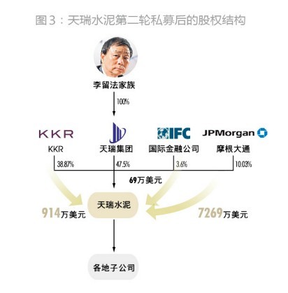 2008年,天瑞水泥繼續獲得第二輪合計8252萬美元私募股權融資,其中摩根大通投資7269萬美元獲得10.03%股權,KKR繼續跟投914萬美元,國際金融公司跟投69萬美元(圖3)。