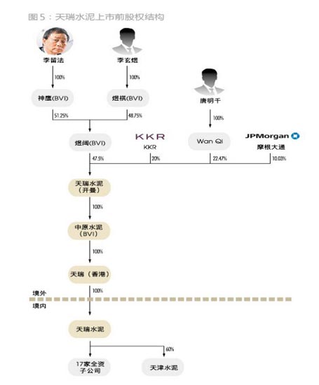 天瑞集團、KKR、摩根大通、Wan Qi(萬祺,2010年入股)作為天瑞水泥的股東,分別與天瑞(香港)簽訂股權轉讓協議,將各自持有的天瑞水泥轉讓給天瑞(香港)。其中,收購天瑞集團所持的股權,由天瑞(香港)以現金代價8743萬美元支付;收購KKR等財務投資人所持有的合計52.5%股權,由天瑞水泥(開曼)合計發行52.5萬股股票,分別按比例予以支付。天瑞集團拿到該筆款項之后,李家父子于2011年5月31日將該筆資金轉移至境外,并用于認購天瑞水泥(開曼)所增發的47.5萬股股份。至此,天瑞水泥的紅籌架構徹底完成(圖5)。