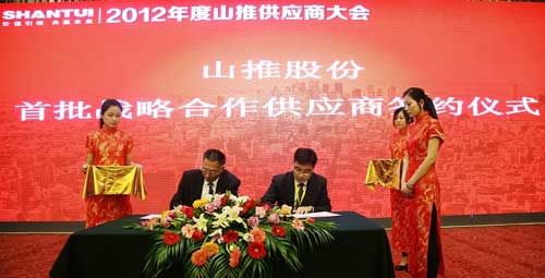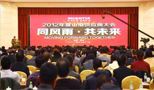 12月12日,以“同風雨共未來”為主題的2012年度山推供應商大會在濟寧圣都國際會議中心召開。山推董事長張秀文,副總經理李殿和、曹永信、孫甲利,精益生產項目專家三原健、高木和夫、鍵谷哲夫,山推采購管理部、生產管理部、質量管理部、企業文化部等相關職能部室及事業部相關負責人出席了此次供應商大會。來自全國240家山推供應商的近400位代表參加了會議。