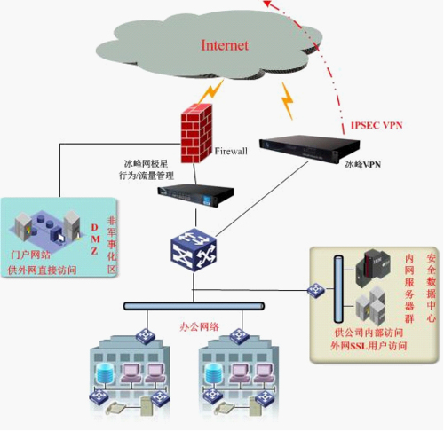 冰峰VPN作為外網出口核心,通過IPSEC VPN與下屬14個攪拌站的分支VPN設備進行網絡互聯,為兩地業務人員提供資源共享、應用授權。外出辦公人員及智能移動用戶則通過SSL VPN接入冰峰VPN,可隨時隨地的安全訪問公司及攪拌站內網資源。