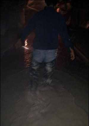 第二天一早,在阿希金礦工作人員的陪同下,兩位工程師深入地下300米的礦洞中,陰冷、潮濕是這里的主旋律,在這里手機沒有信號,由于連續開車服務工程師只是吃了兩口干糧,走到這里雙腿已經發軟。礦井里的淤泥蓋過了他們的膝蓋,即使穿著很深的靴子也無法正常走路。走到半路中,突然傳來一聲巨響,地動山搖,耳膜感覺一陣震痛,沒錯,這正是開礦時的炸藥聲,心中對塌方的隱憂讓工程師加快了步伐。就這樣,蹣跚而行了兩公里,工程師終于走到托泵所在地。