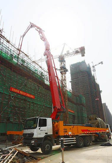 日前,徐工新一代“K”系列產品——全球三橋最長全鋼臂架50米泵車在徐州某工地完美施工,該產品以全球最長全鋼臂架成功挑戰(zhàn)3橋底盤極限,創(chuàng)領同類產品技術新高度。記者在現場看到,施工場地異常狹小,且崎嶇不平,該產品在后支腿與車身縱向夾角不到30°的情況下,以平均每小時澆筑60-70方的速度連續(xù)工作10小時以上,以其完美的施工效果成功完成首秀。