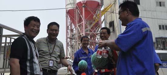 一線員工奮戰期間,公司行政中心后勤部劉禎峰、企劃部李良明等在混凝土物流中心領導的陪同下,代表公司看望和慰問在高溫酷暑下仍堅守于生產第一線的攪拌站全體員工。標志著2013“送清涼”活動正式啟動。