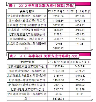 杜書明舉報的事情撲朔迷離,難以理清頭緒,但是可以確認的是,北京城建及其下屬公司的財務確實有問題。記者通過查閱北京城建2012年年報與2013年半年報,發現該公司在關聯方應付賬款上兩份報告數字有多處差異,前后差異嚴重,總量相差2557萬元(見表1和表2)。