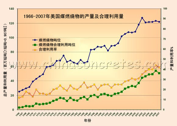 近日,美國行業專業協會就統計了1966-2007年美國煤燃燒物的產量及合理利用量,隨著工業化的增加,美國煤燃燒物的產量由1966年的約22.6噸上升到2007年的108.9噸左右,而其利用率也由1966年的10%左右上升到2007年的40%,其統計圖表如下: