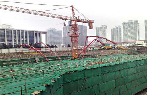 蘇州潤(rùn)華環(huán)球大廈,一座集商業(yè)中心、酒店式公寓、辦公大樓于一體的摩天大樓。占地面積約15000平方米,總建筑面積約18萬平方米,結(jié)構(gòu)高度約190米,總高度約286米。這座即將成為蘇州新地標(biāo)的建筑,其混凝土泵送的主力設(shè)備清一色采用的是三一重工泵車。