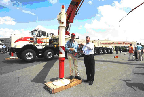 Dave Adams,普茨邁斯特美國公司總裁,將M70-5混凝土泵車鑰匙交給Mike Parigini, 美國聯(lián)合混凝土泵送公司的業(yè)主兼總裁。