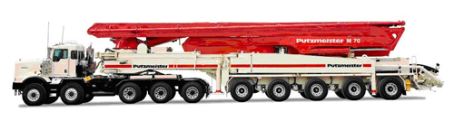 為符合美國加州及其它州的法規(guī),普茨邁斯特采用10橋掛式底盤研制的世界最長臂架的混凝土泵車—M70-5。