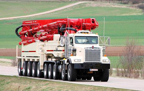 為了符合美國當(dāng)?shù)胤ㄒ?guī),普茨邁斯特公司將M70-5的上裝安置在一臺10橋的半掛車上,但為歐洲及其它地區(qū)客戶提供的配置會有所不同。布料桿、機(jī)架、支腿、中心泵及獨(dú)立發(fā)動機(jī)(道依茲330kW, 6缸柴油發(fā)動機(jī),歐3排放標(biāo)準(zhǔn))放置在掛車上,該掛車為5橋,其中3個(gè)為轉(zhuǎn)向橋。該客戶選擇了一臺功率為370kW的Kenworth C500B (10 x 6/4)作為拖車。在拖車的5橋中,有3個(gè)橋是驅(qū)動橋(其中有2個(gè)橋?yàn)橐簤候?qū)動,適合在復(fù)雜地形上慢速行駛),還有2橋?yàn)檗D(zhuǎn)向橋。