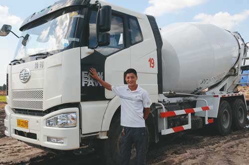 胡長亮說:“我開這輛車兩個月,沒出現過任何問題。一汽解放專門為我們公司這20輛車配了2名維修服務人員,可隨時隨地提供服務。原來我開其他品牌攪拌車的時候,從來沒享受過這樣的待遇。以前車出了問題,司機就把車開到當地服務站去檢查,有時候修車要等一兩天。現在一汽解放把維修服務人員派到我們公司定點服務,如果車出了問題,服務人員很快就能趕到現場排除故障,保證車輛正常作業。據我了解,長春有很多解放車的用戶享受到了這種駐點式的服務。”