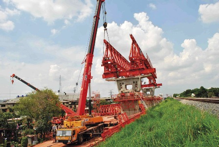 泰國黃色捷運線工程使用的主要混凝土構建重達80噸,橋式起重機的重量超過200噸,這對起重機來說是一個挑戰。三一和國外某知名品牌汽車吊在捷運線上通力協作。