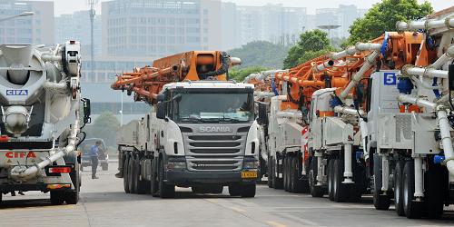 一輛組裝下線的泵車駛出中聯(lián)重科總裝車間