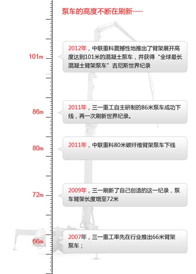 2012年9月28日,在中聯重科成立20周年慶典上,中聯重科震撼性地推出了臂架展開高度達到101米的混凝土泵車,并獲得“全球最長混凝土臂架泵車”吉尼斯世界紀錄,一舉打破此前由三一重工保持的86米的世界紀錄。一時間激起行業一片驚呼與感嘆:混凝土泵車行業正在展開猶如奧運會激烈般的破紀錄“大戰”,就像人類思考百米跑世界紀錄的極限在哪一樣,我們不得不思索未來混凝土泵車臂架展開高度的極限是多少?市場和用戶是否需要如此直上云霄般的百米長(或更高)泵車嗎?