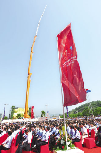2007年,三一重工率先在行業推出66米臂架泵車,一舉超越普茨邁斯特,成為世界最長臂架泵車制造商。當年,三一66米臂架泵車還獲得了世界最長臂架泵車的吉尼斯世界紀錄。值得一提的是,這是中國工程機械行業的第一個吉尼斯紀錄。當時,混凝土泵車領域廣泛流傳這樣一句話:混凝土泵車臂架的長度每增加一米,難度難于上青天。但是,后來的一連串事實證明,中國工程機械企業“上青天”委實不難。