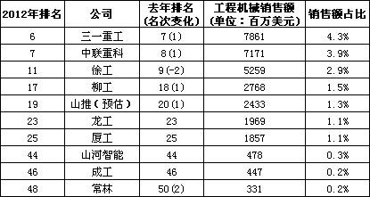 2012全球工程機械50強榜單日前正式發布,中國工程機械行業成績喜人,在2012全球工程機械50強占據了10個名額,特別是中國工程機械行業巨頭三一重工和中聯重科更是躋身2012全球工程機械50強前十的位置。