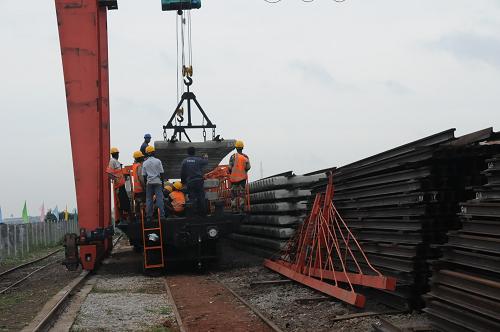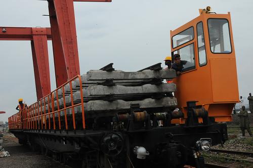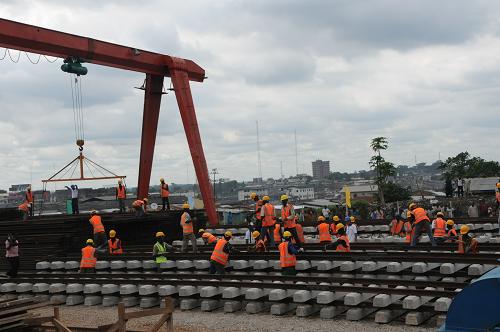 10月11日,在尼日利亞西南部奧約州首府伊巴丹,工人操作大型機(jī)械運(yùn)送混凝土軌枕。