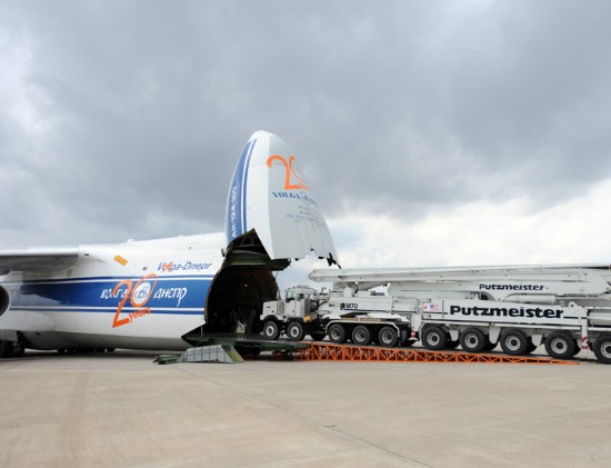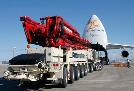 圖為世界上最大型的混凝土泵車之一在洛杉磯機場裝載上機。