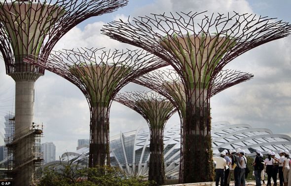 新加坡中部正在建造一片面積巨大的人造森林,森林中的巨樹高達50米,由金屬和混凝土制成。這些巨樹長著巨大的混凝土樹干,重量達到數百公噸。樹枝和樹冠采用盤條,共耗費數千根。