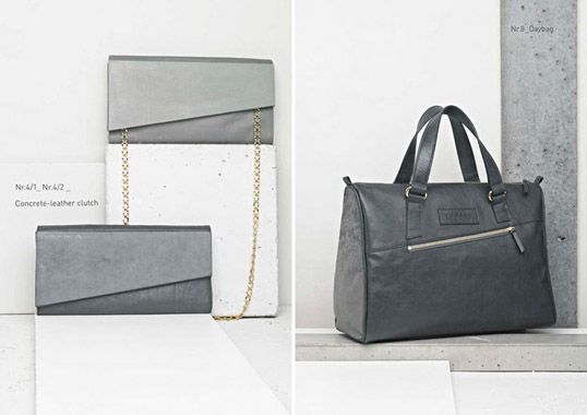 2012年9月,巴黎時裝周,一個由混凝土制作的時尚系列徹底震撼了人們的視覺。這個創新的時尚系列為經典的女性柔美注入了陽剛元素,更符合當今現代都市女性的性格。將混凝土的機理用不同柔軟度的紡織物體現,再通過各種形狀和材質展現紛呈魅力。箱包的設計甚至引入整塊混凝土與高品質皮革搭配,兩者之間比例的變化形成各有千秋的效果。用日常性的設計超越生活。