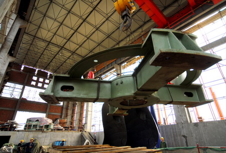 6月4日,技術人員在南水北調臺兒莊泵站安裝大型機組配件。