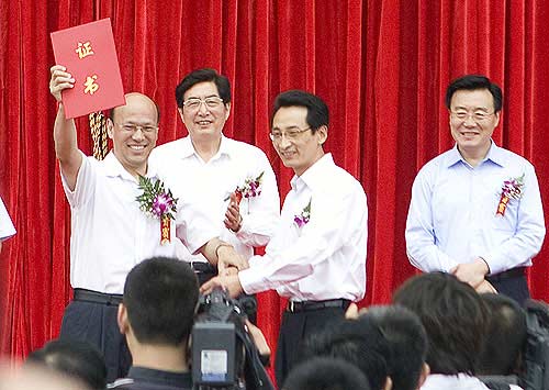 劉淇(右一)與郭金龍(左一)為紀念柱揭幕