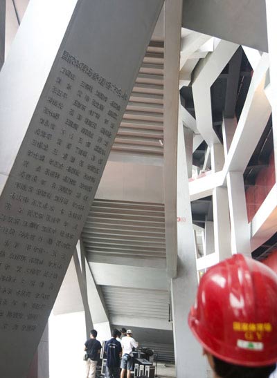 鳥巢紀念柱書寫著鳥巢建設中的大事