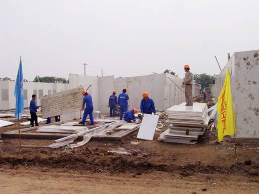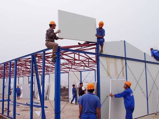 一期活動板房建設現場:主要用彩鋼板進行拼接