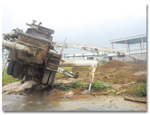 在現(xiàn)場發(fā)現(xiàn)一臺澆灌車后輪高高翹起,澆灌車前支架及前臂已經(jīng)陷入泥中,事故中兩名受傷工人已被送往合肥市三院進行治療。據(jù)目擊者介紹,被壓住腿的工人張某在營救人員近兩個小時的營救下,才從水泥澆灌車下成功脫險。據(jù)附近工作的工人推測,此次事故很可能是雨后導致泥土松軟造成的。