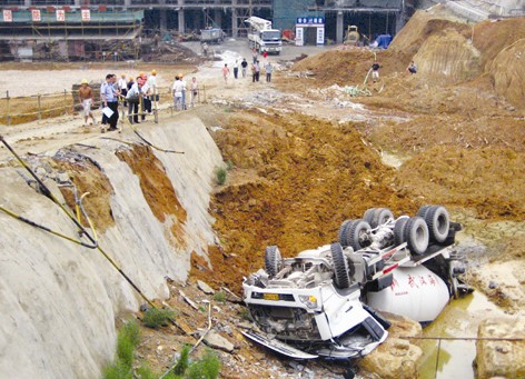 昨日(28日)上午,武昌岳家嘴一工地發生慘?。阂惠v滿載混凝土的槽罐車,在約30度斜坡的路面上倒車時,由于天雨路滑剎車不及,不幸墜入路邊約六米深的大坑里,司機當場身亡。