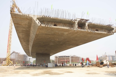 石環公路跨石太鐵路轉體橋為四跨連續獨塔單索面的預應力混凝土斜拉橋,采用墩、塔、梁固結體系。該橋最大特點是轉體重量16200噸,為世界之最;轉體角度75.74度,該指標居全國同類橋梁第一。