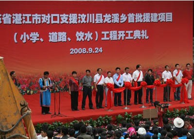 廣東省湛江市援建四川地震災區(qū)汶川縣龍溪鄉(xiāng)中心小學、龍溪鄉(xiāng)東門口至龍溪鄉(xiāng)政府道路、龍溪鄉(xiāng)供水改造工程今天正式啟動,并力爭于明年9月投入使用。