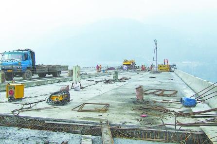 都汶高速公路廟子坪特大橋所有橋身的復(fù)位工作已經(jīng)完成,發(fā)生橋身跌落的第10跨橋面混凝土也已鋪設(shè)完畢。記者昨日在大橋上看見(jiàn),第10跨橋面外觀已和整座大橋融為一體,如不仔細(xì)察看,很難看出這跨橋身曾因地震發(fā)生過(guò)跌落。目前,施工人員正在橋面新鋪的混凝土上切割收縮縫。
