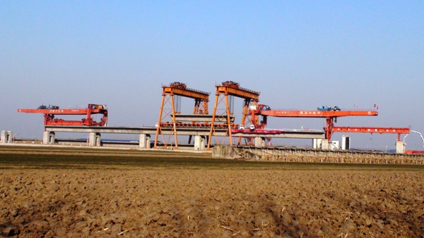 六公司京滬鋪架工區下設架梁一、二、三隊和鋪軌隊,架梁一隊以固鎮城關梁場為起點向北架梁,自12月7日成功架設第一片整孔箱梁以來已架梁12孔,架梁速度正穩步提升;架梁二隊和架梁三隊起點位于磨盤張梁場,自11月下旬進場以來,經過全體參建員工夜以繼日的勞作,現已完成2臺900T架橋機和運梁車的組裝,將于本月20號向上海和北京兩個方向同時架梁。
