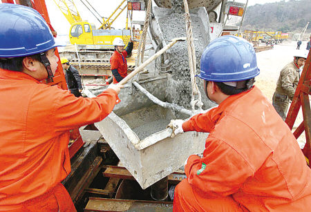 圖為象山港大橋建設(shè)者正在南岸第一根鉆孔灌注樁施工現(xiàn)場(chǎng)灌注最后一車混凝土。