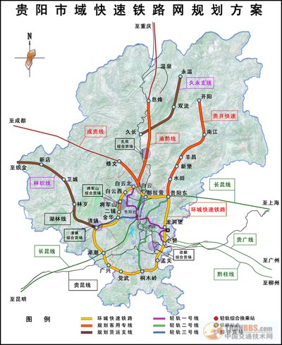 貴陽市委、市政府搶抓中央擴大內需、增加投資的難得機遇,認真貫徹省委、省政府關于加快推進快速鐵路系統建設的指示精神,積極適應貴陽至廣州、貴陽至重慶、貴陽至成都、貴陽至長沙、貴陽至昆明快速鐵路建設的新形勢,結合貴陽城市總體規劃、城市綜合交通規劃和輕軌路網規劃,認真研究提出了建設市域快速鐵路網的構想,主要內容是“一環一射兩聯線”。