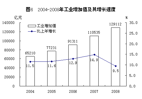 全年規模以上工業中,煤炭開采和洗選業增加值比上年增長19.1%,石油和天然氣開采業增長6.1%,文教體育用品制造業增長18.2%,燃氣生產和供應業增長26.8%,農副食品加工業增長15.0%,通用設備制造業增長16.9%,交通運輸設備制造業增長15.2%,通信設備、計算機及其他電子設備制造業增長12.0%,電氣機械及器材制造業增長18.1%,化學纖維制造業增長2.2%。6大高耗能行業比上年增長10.0%,其中,非金屬礦物制品業增長16.9%,黑色金屬冶煉及壓延加工業增長8.2%,化學原料及化學制品制造業增長10.0%,有色金屬冶煉及壓延加工業增長12.3%,電力熱力的生產和供應業增長8.6%,石油加工煉焦及核燃料加工業增長4.3%。高技術制造業增加值比上年增長14.0%。