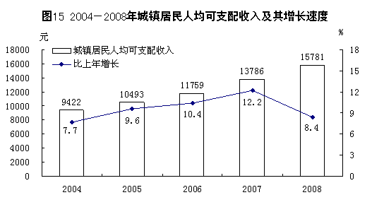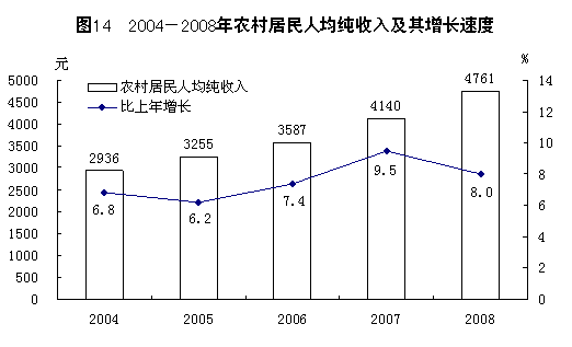 全年農村居民人均純收入4761元,扣除價格上漲因素,比上年實際增長8.0%;城鎮居民人均可支配收入15781元,實際增長8.4%。農村居民家庭食品消費支出占家庭消費總支出的比重為43.7%,城鎮居民家庭為37.9%。按2008年農村貧困標準1196元測算,年末農村貧困人口為4007萬人。